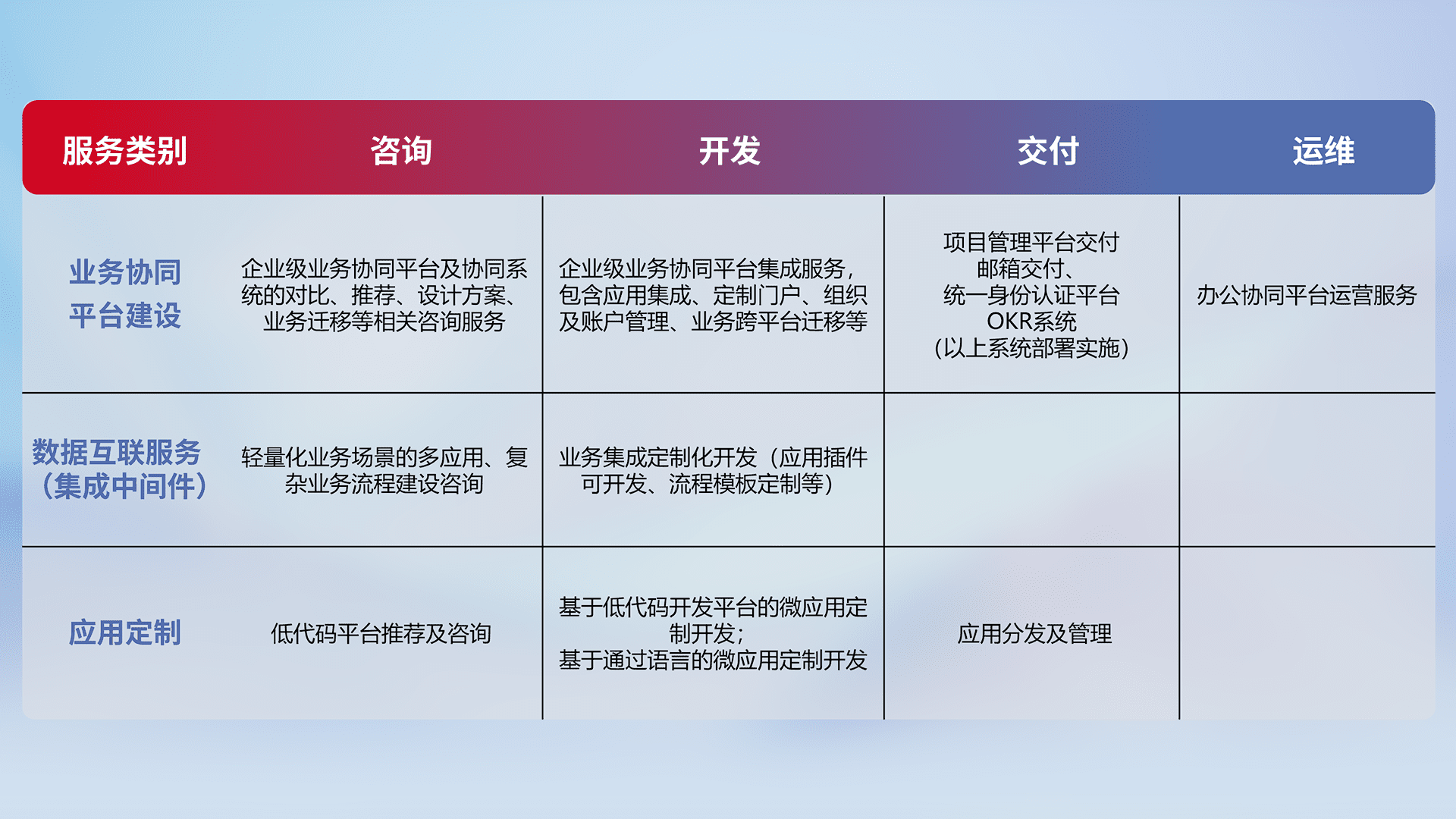 针对钉钉、、企微、、、IDaas等平台级产品提供产品的规划、、、、方案、、、、交付、、定制化开发等服务,,实现如统一协同办公、、、、智能客户服务、、混合会议管理、、、、智能数据查询、、、等业务场景,,,实现数字化转型。。。。